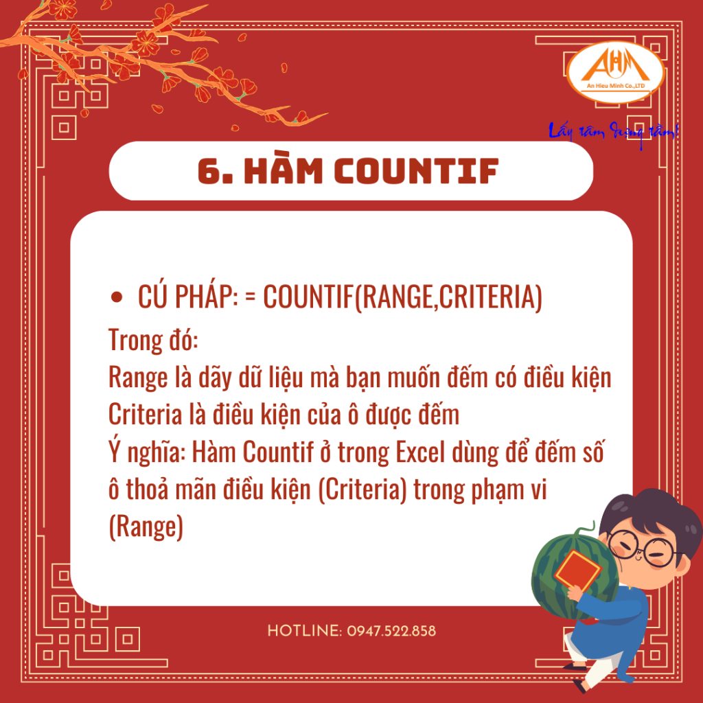 Ý nghĩa: Hàm COUNTIF TRONG excel dùng để đếm số ô thỏa mãn điều kiện (Criteria) trong phạm vi (Range)